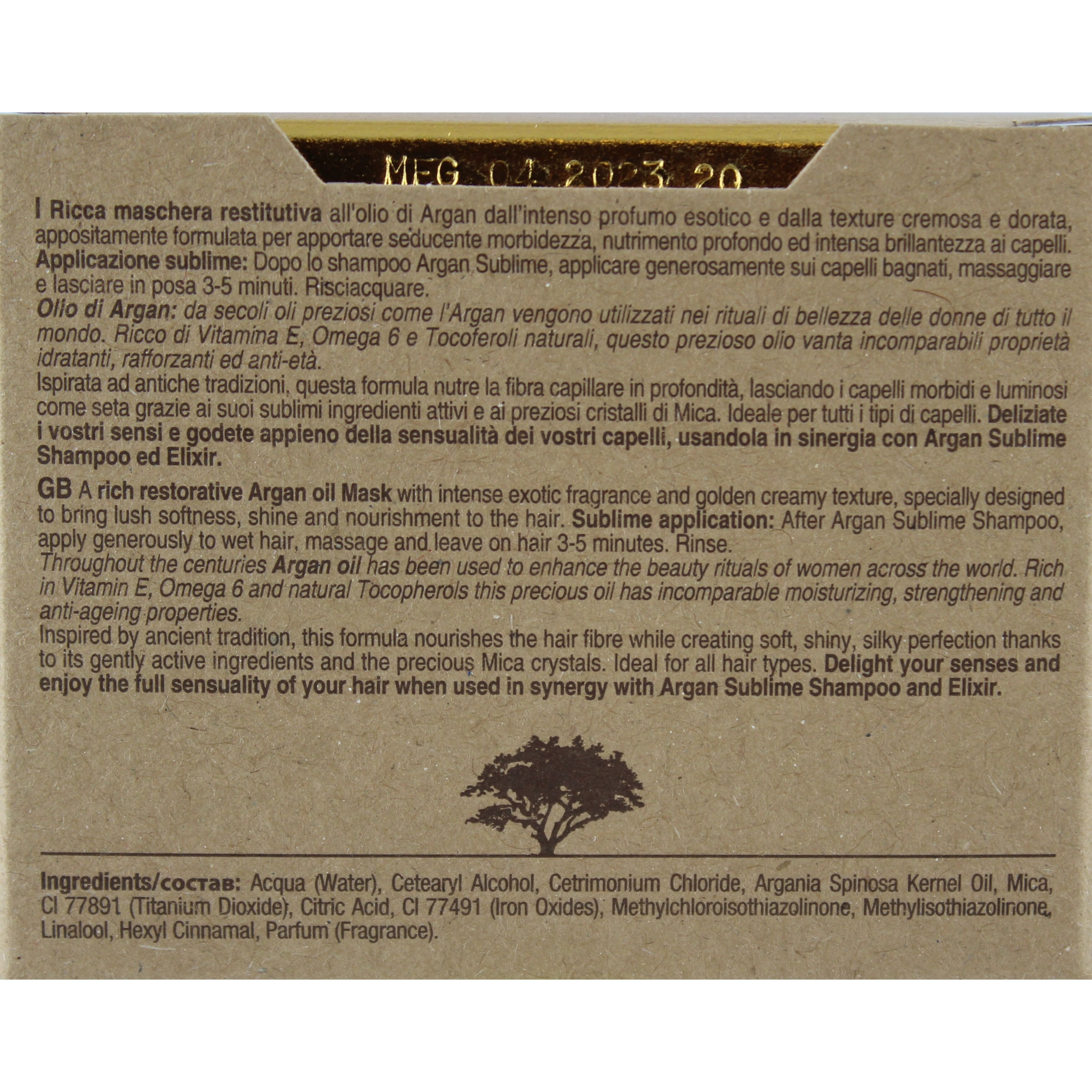 Die reichhaltige, strukturaufbauende Arganöl-Maske mit intensivem, exotischem Duft in goldener cremiger Textur, verleiht dem Haar perfekte Geschmeidigkeit und Glanz bei gleichzeitigem Haaraufbau. Ideal für alle Haartypen. Diese von alter Tradition inspirierte Formel, stärkt die Haarfaser und macht das Haar weich, glänzend und seidig. Dies geschieht aufgrund der sanften Wirkstoffe und durch die kostbaren Mica-Kristalle.