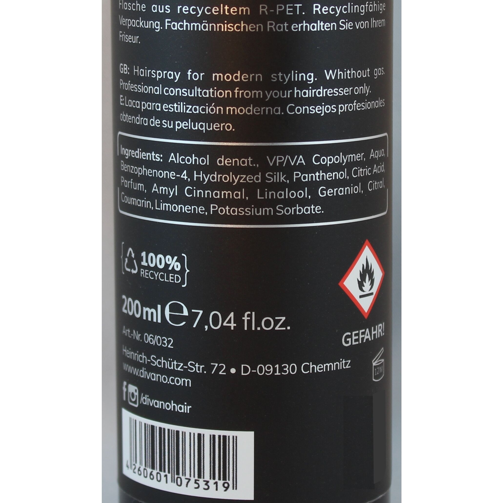 | Inhaltsstoffe | Alcohol denat., VP/VA Copolymer, Aqua, Benzophenone-4, Hydrolyzed Silk, Panthenol, Citric Acid, Parfum, Amyl Cinnamal, Linalool, Geraniol, Citral, Coumarin, Limonene, Potassium Sorbate. |