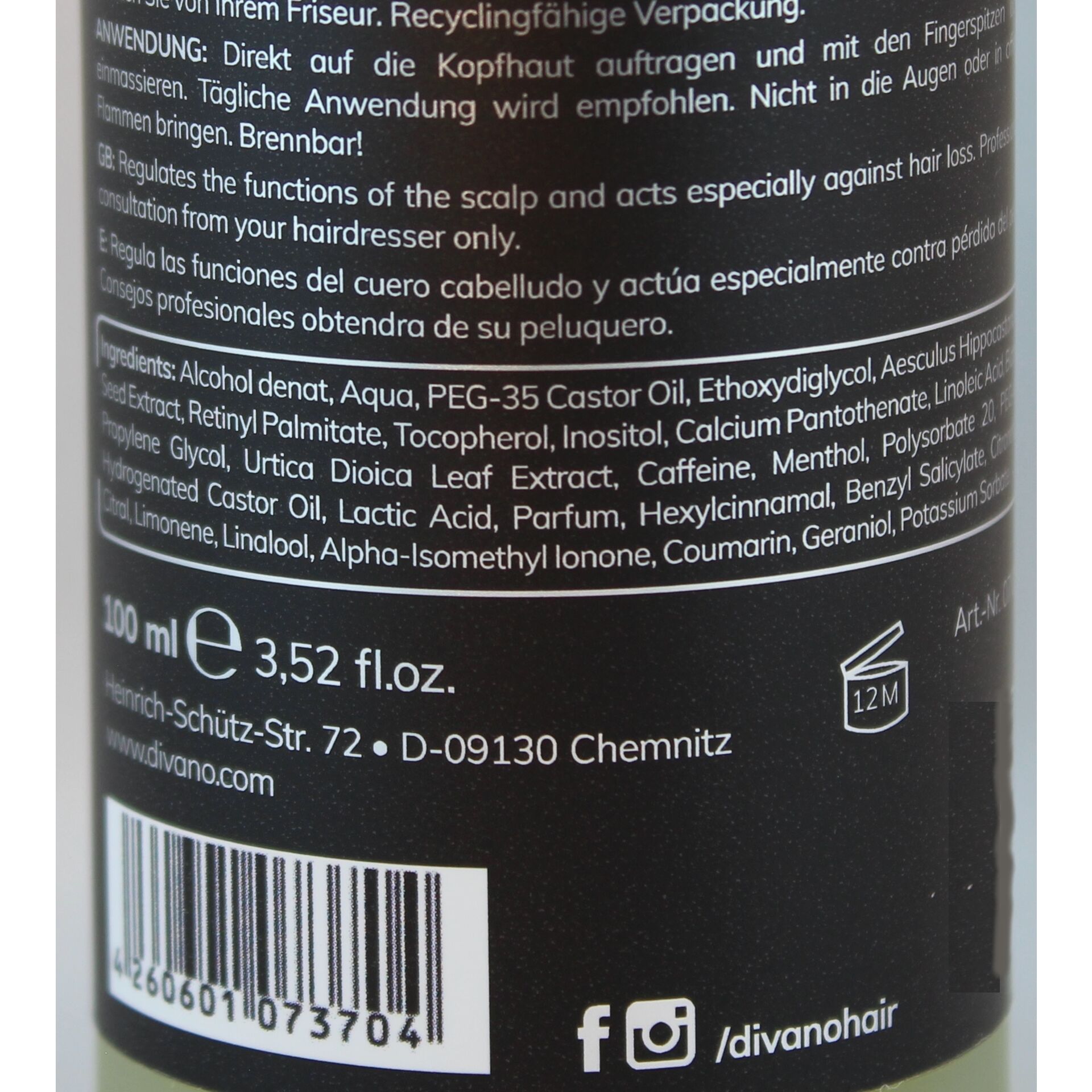 | Inhaltsstoffe | Alcohol denat, Aqua, PEG-35 Castor Oil, Ethoxydiglycol, Aesculus Hippocastanum Seed Extract, Retinyl Palmitate, Tocopherol, Inositol, Calcium Pantothenate, Linoleic Acid, Biotin, Propylene Glycol, Urtica Dioica Leaf Extract, Caffeine, Menthol, Polysorbate 20, PEG-40 Hydrogenated Castor Oil, Lactic Acid, Parfum, Hexylcinnamal, Benzyl Salicylate, Citronellol, Citral, Limonene, Linalool, Alpha-Isomethyl Ionone, Coumarin, Geraniol, Potassium Sorbate. |